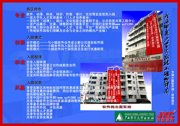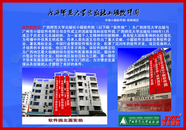 廣西師范大學出版社小聰軟件園(以下稱“軟件園”)為廣西師范大學出版與廣州市小聰軟件有限公司合作成立的國家級高科技軟件園,是小聰軟件園向全國發展過程中邁出的重要一步,合作方廣西師范大學出版社1986年11月成立于歷史文化名城桂林,為一家富于人文精神和創新精神、具有較大國際影響的名社強社為傳播中外優秀文明成果、傳承人類先進文化作出了重大貢獻。小聰軟件作為國家優秀軟件企業、著名商標企業、中國行業管理軟件領先企業,積累了近20年的軟件開發、項目實施和人才培養的豐富經驗,小聰軟件憑借在廣州以及江蘇地區成功運營軟件園的經驗,計劃利用半年左右的時間將桂林園區打造成為廣西地區最大規模的綜合型軟件配套商務園區,面向中小型及創業型企業。軟件園規劃目標為三期,第一期位于學術氛圍濃厚的廣西師范大學南門附近,入園企業可享受校園儒雅的人文氣氛,又可直接從名校吸納人才作為企業發展的后備軍。