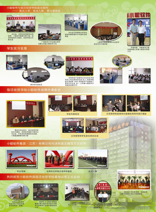 小聰軟件集團——是國家雙軟認定企業、廣東省著名商標企業。成立于1991年,是一家專業從事計算機軟件研發、集成及銷售的高新技術企業。集團下設“小聰軟件”、“小聰電腦”、“小聰學院”、“小聰軟件園”等多家獨立營運機構。為了滿足社會對創新人才發展的需求,江蘇省宿遷經貿學院和廣州小聰軟件(集團)江蘇有限公司簽訂聯合辦學協議,共同培養具有軟件技術、營銷與管理等綜合能力的創新型人才。學生在校期間完成國家規定“學歷”學習,同時得到企業“能力”的訓練,可在小聰軟件集團獲得實用技能的定向培訓,學習與實踐相兼,實現就業零過渡,零距離接觸企業、無障礙融入社會;感知成功企業18年創業經驗,獲得與知名企業家互動的機會,增強社會實踐能力,提高就業競爭力—— “畢業=就業”而非“畢業=失業”。 學生畢業就業有保障。
