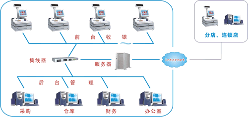 下圖為系統(tǒng)的架構(gòu)圖。除了便捷的前臺(tái)POS功能,還有更加強(qiáng)大的后臺(tái)進(jìn)貨、銷售、倉(cāng)庫(kù)、查詢等功能,還可以通過internet網(wǎng)絡(luò)實(shí)現(xiàn)遠(yuǎn)程傳輸功能,可管理遠(yuǎn)在異地的分店、連鎖店等。